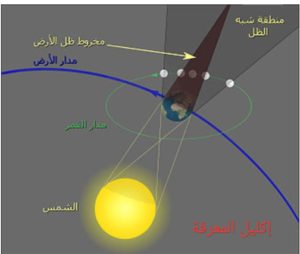 2 – ثم يبدأ القمر بدخول منطقة ظل الأرض (umbra) فيبدأ الخسوف الجزئي. ومنطقة ظل الأرض هي المنطقة التي تنحجب فيها الشمس كاملة بسبب الأرض.
