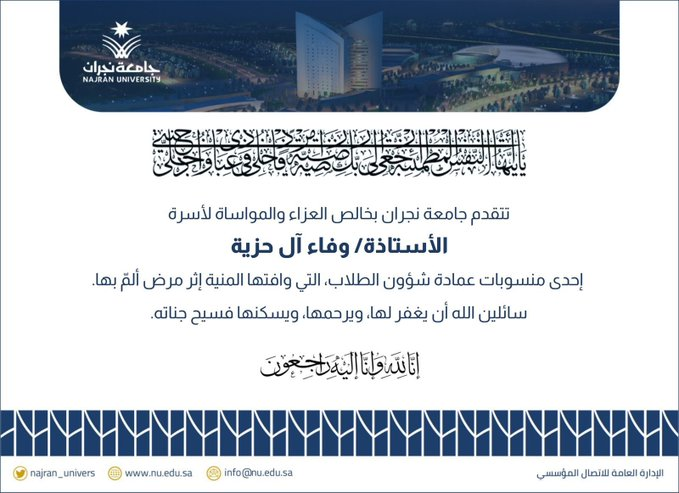 انتقل لرحمته تعالى قبل ساعات من الان الاستاذة وفاء آل حزية وذلك اليوم السبت لموافق 11 من محرم لعام 1445ه والموافق 29/7/2023 وذلك بعد ان تعرض لوعكة صحة ولقد انتقل للمستشفى للوقوف على الحالة الصحية له ولقد اوصى الاطباء ببقائه في المستشفى الا انه سرعان مان فارق الحياة منتقلا من دار الفناء لدار الخلود والبقاء ..