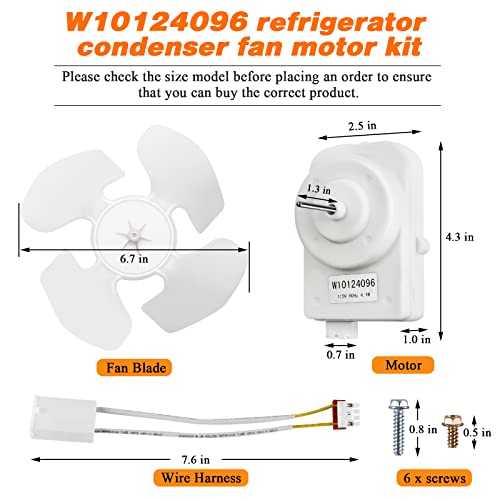 W10124096 Refrigerator Condenser Fan Motor – Fit for Whirlpool Refrigerator Fan Motor – EAP1957416 AP4318657 PS1957416 W10124096VP 2315558 – Includes Fan Motor, Fan Blade, Wiring Harness,Hardware